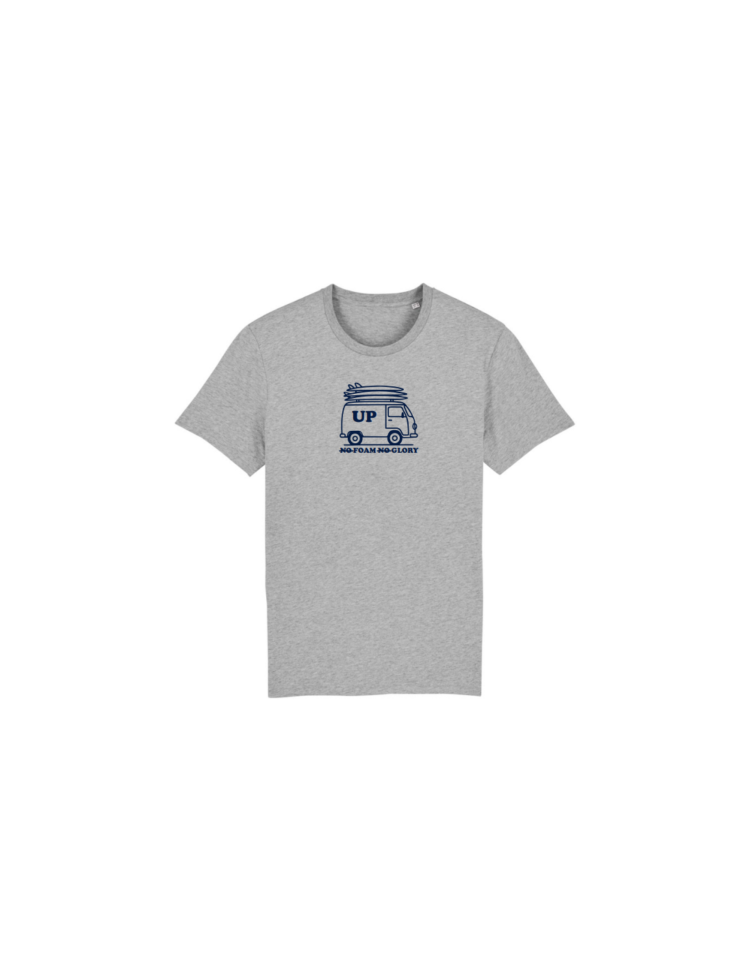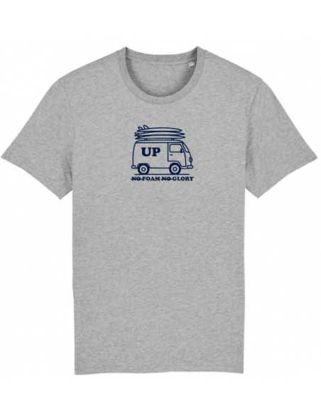 Camiseta básica de corte unisex, hecha con 100% algodón orgánico. Incluye un estampado frontal con una furgoneta y el texto “UP - No Foam No Glory”.